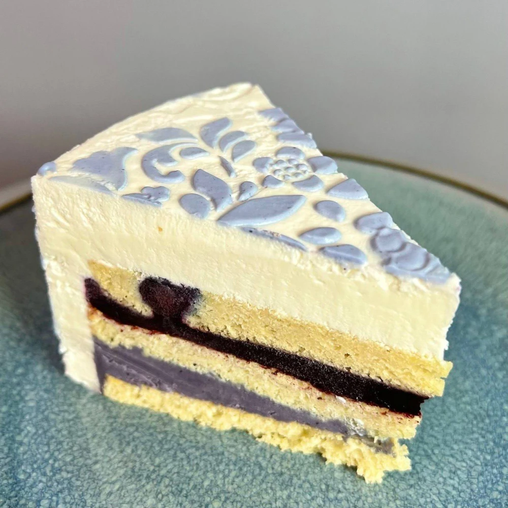 • Миндальный бисквит с голубикой, две ягодные прослойки из черники и голубики, нежный мусс с лавандовыми нотками