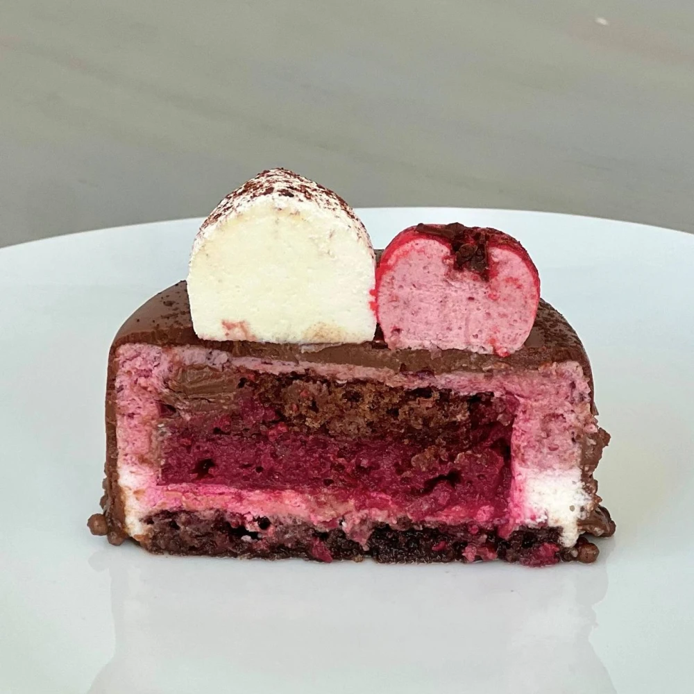 • Шоколадный бисквит, пропитанный сахарным сиропом, вишневое конфи с кусочками вишни, нежный ванильный мусс на основе взбитых сливок и маскарпоне, нежный вишневый мусс, покрытие шоколадный ганаш. Вишни-вишневый мусс, покрытый тонким слоем шоколадного велюра. Лепесток-ванильный мусс, покрытый тонким слоем шоколадного велюра