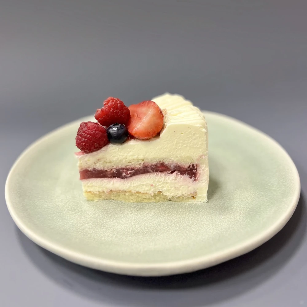 • Миндальный бисквит, компоте с кусочками клубники,  нежный мусс с ванилью с белым шоколадом , украшены ягодами
