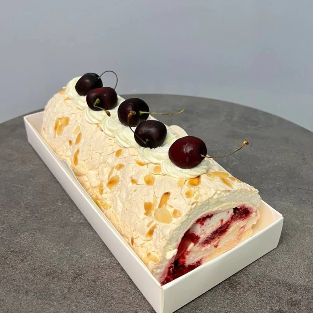 • Запеченая меренга, вишневая прослойка, крем пломбир с маскарпоне и цедрой лимона. Вишня коктейльная для декора.